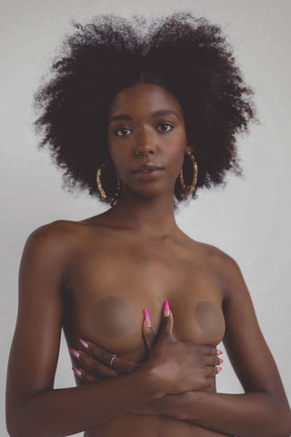 Pasted Nip pasties are made with body safe silicone. Our pasties come in light, medium, and dark with a round shape versatile enough to fit over a variety of nipple shapes and sizes. Our pasties matte finish ensures they will not shine through clothing in photographs or bright lighting. Waterproof & sweatproof, ensuring enough stickyness for up to 15x wears.